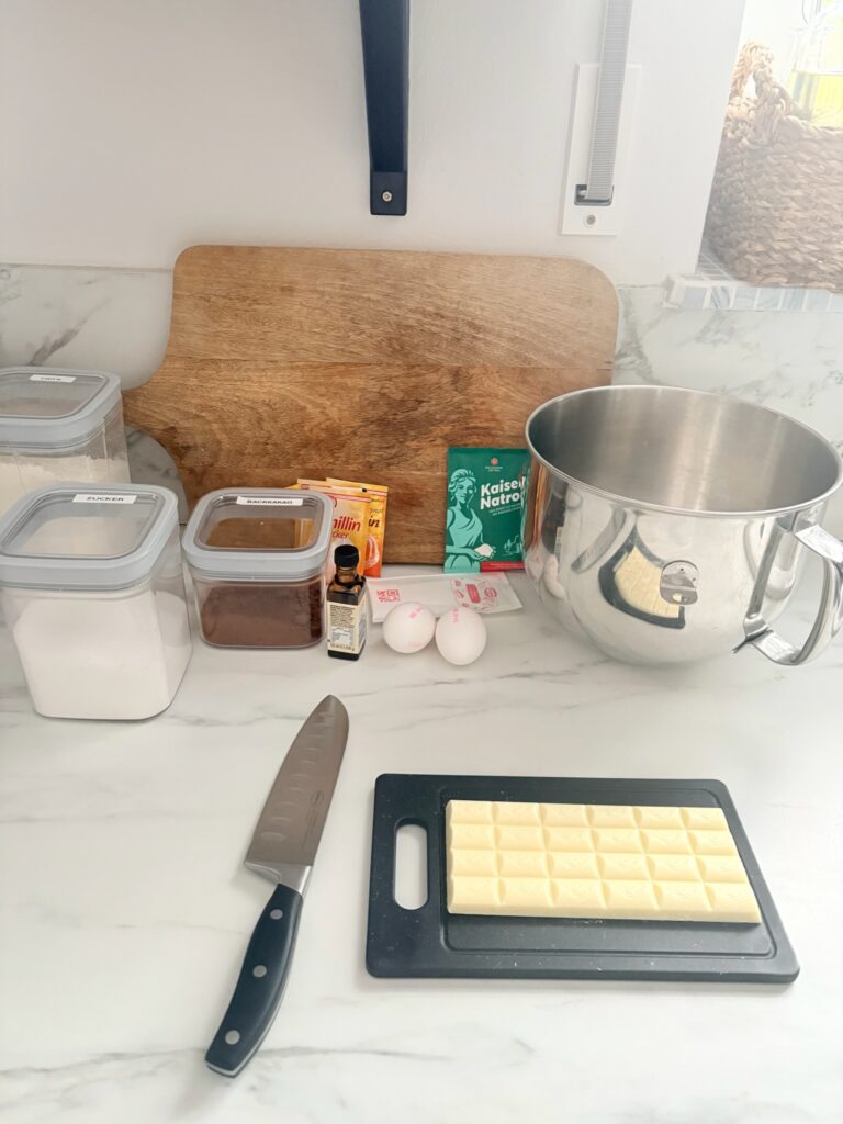 - 100 g weiße Schokolade für hellen Teig (alternativ: dunkle Schokolade für hellen oder dunklen Teig)