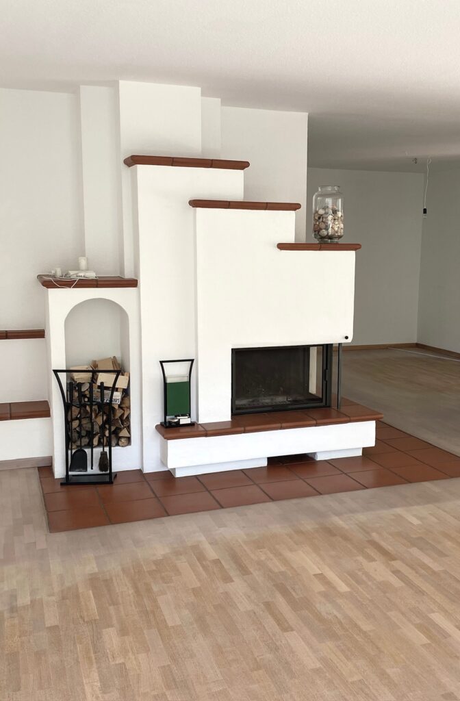 Die Platten lagen rund um den Kamin auf dem Boden, dazu Abdeckplatten auf mehreren Ebenen oben auf dem Kamin. Auch hier wieder: alles solide und ordentlich verarbeitet. Und nur weil uns eine Farbe nicht gefiel, wollten wir ganz sicher keine Fliesen rausreißen und eine Baustelle im Wohnzimmer eröffnen. Also griffen wir wieder zu unserer bewährten Lösung: einem Eimer Farbe.